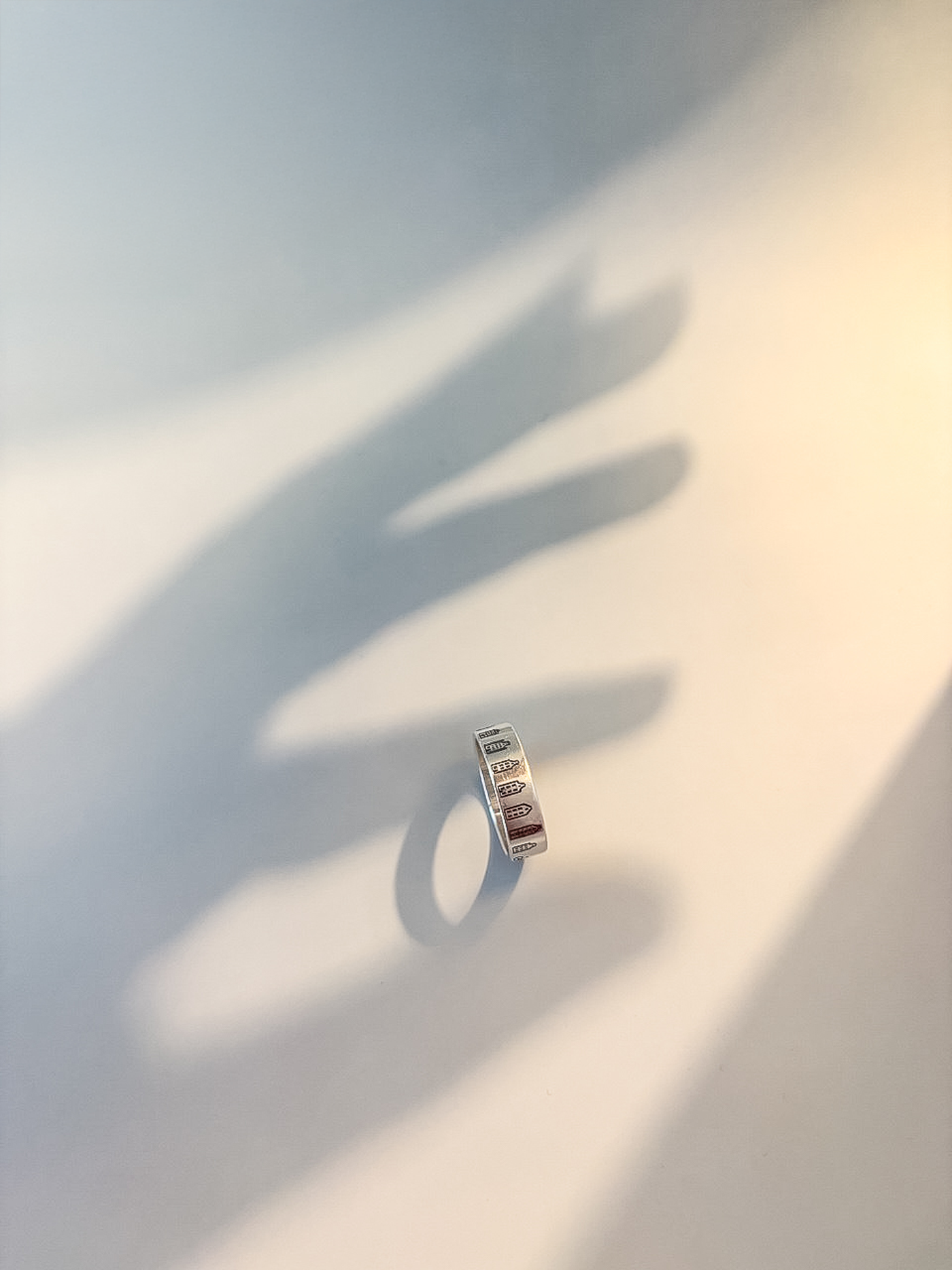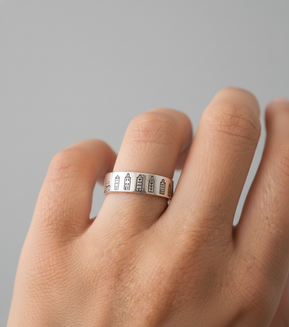 The visual language of the ring is defined by its balance between precision and softness. Clean, consistent engraving lines emphasize the architectural rhythm of Amsterdam’s façades, while the polished silver surface reflects light gently, adding a quiet sense of movement.
